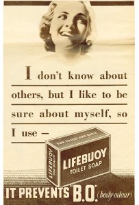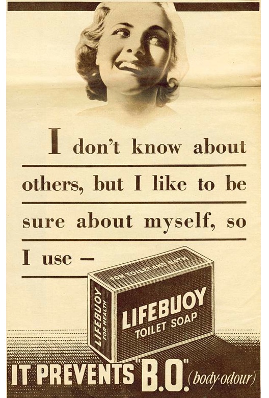 The makers of Lifebuoy soap came up with the answer. They invented B.O. The vaguely scientific abbreviation for Body Odour was delivered in a dramatic whisper to the hapless non-Lifebuoy user. Before long, kids everywhere would be stage-whispering the damning indictment to anyone they wanted to pick on. It lasted for years as a killer put-down, maybe still does.