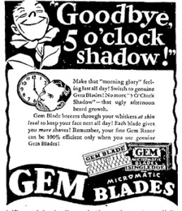 came the dread concept of ‘Five O’clock Shadow’. Aaaarrrghh! Social disaster. Only one way to head it off – use the right razor blade in the morning. The Gem Micromatic Blades company introduced the phrase in a 1930s advertising campaign. Result? Fear of something you never even knew existed, and an addition to the language which now seems as if it’s always been there.