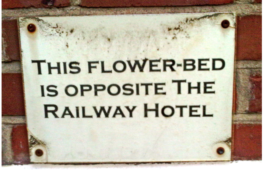 The ‘This flowerbed is opposite the Railway Hotel’ is one of my favourite signs ever, and I spend many an amusing moment as my dog sniffs the lamppost near it wondering why it was put up. I assume it was so that council gardeners know where to plant, dig etc, but why aren’t other flowerbeds similarly marked?